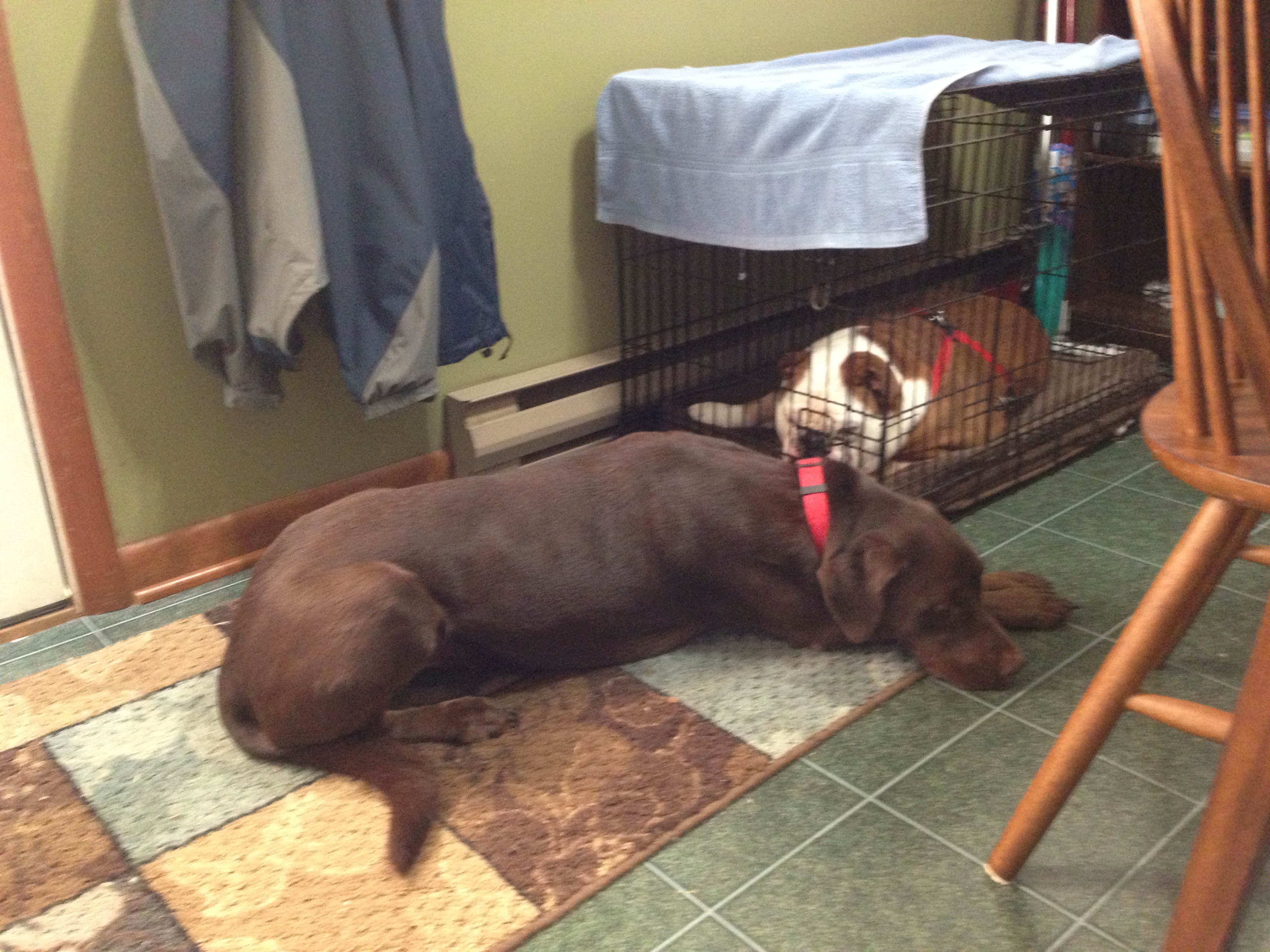 Maggie spent all day yesterday roaming the house looking for him and is currently trying to wrap her little brown head around why he doesn’t seem to want to play. For the moment, though, she seems happy crashing next to his crate and keeping an eye on things. It appears that this is what the rest of the weekend will look like.