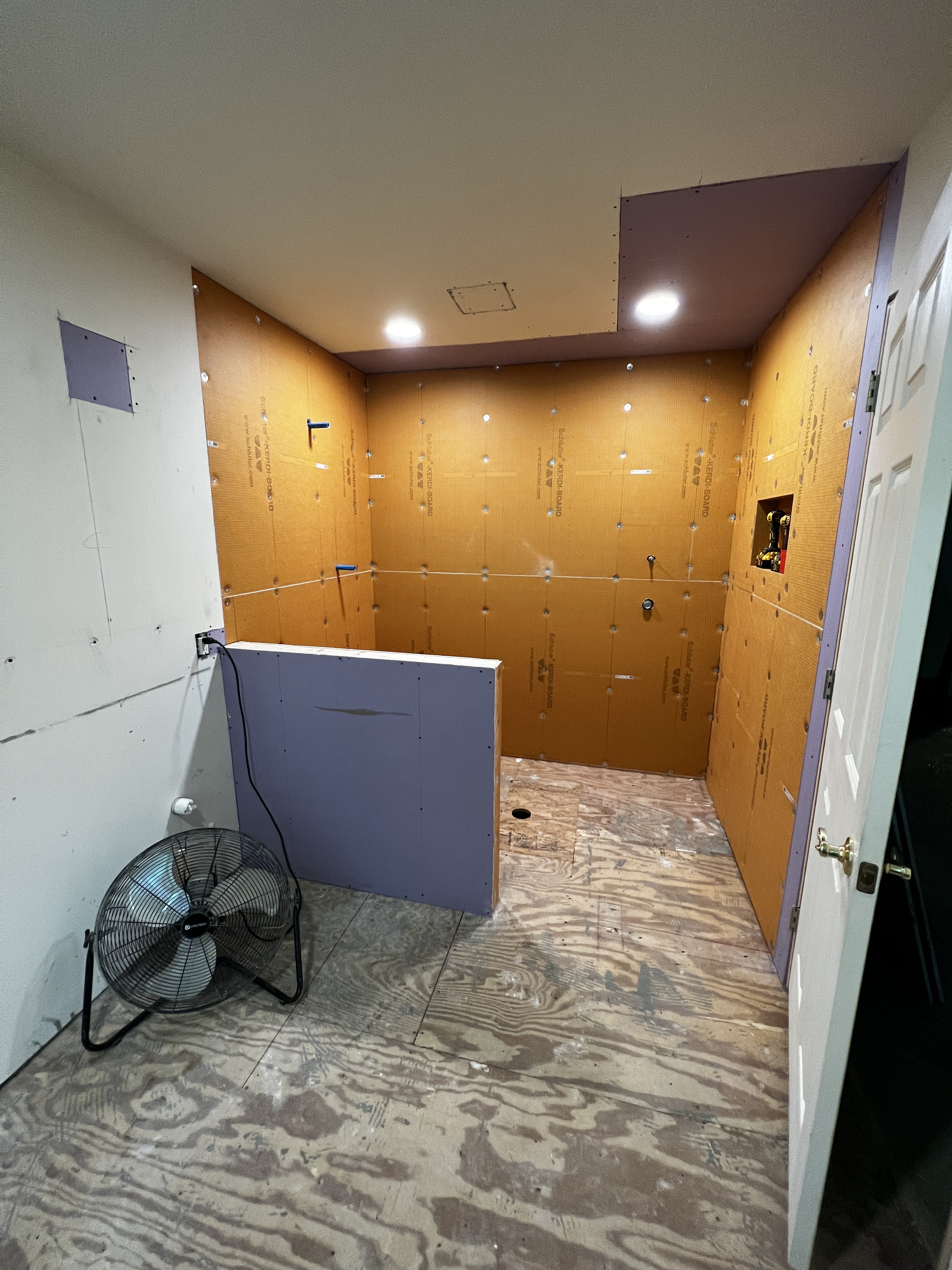 After pissing away 14 days waiting for the county, we’re back in business. My crew of two has been here the last two days, patching holes, closing up the walls, and generally getting everything set to install the shower pan, lay in the heated floor, and start working through a small mountain of tile.