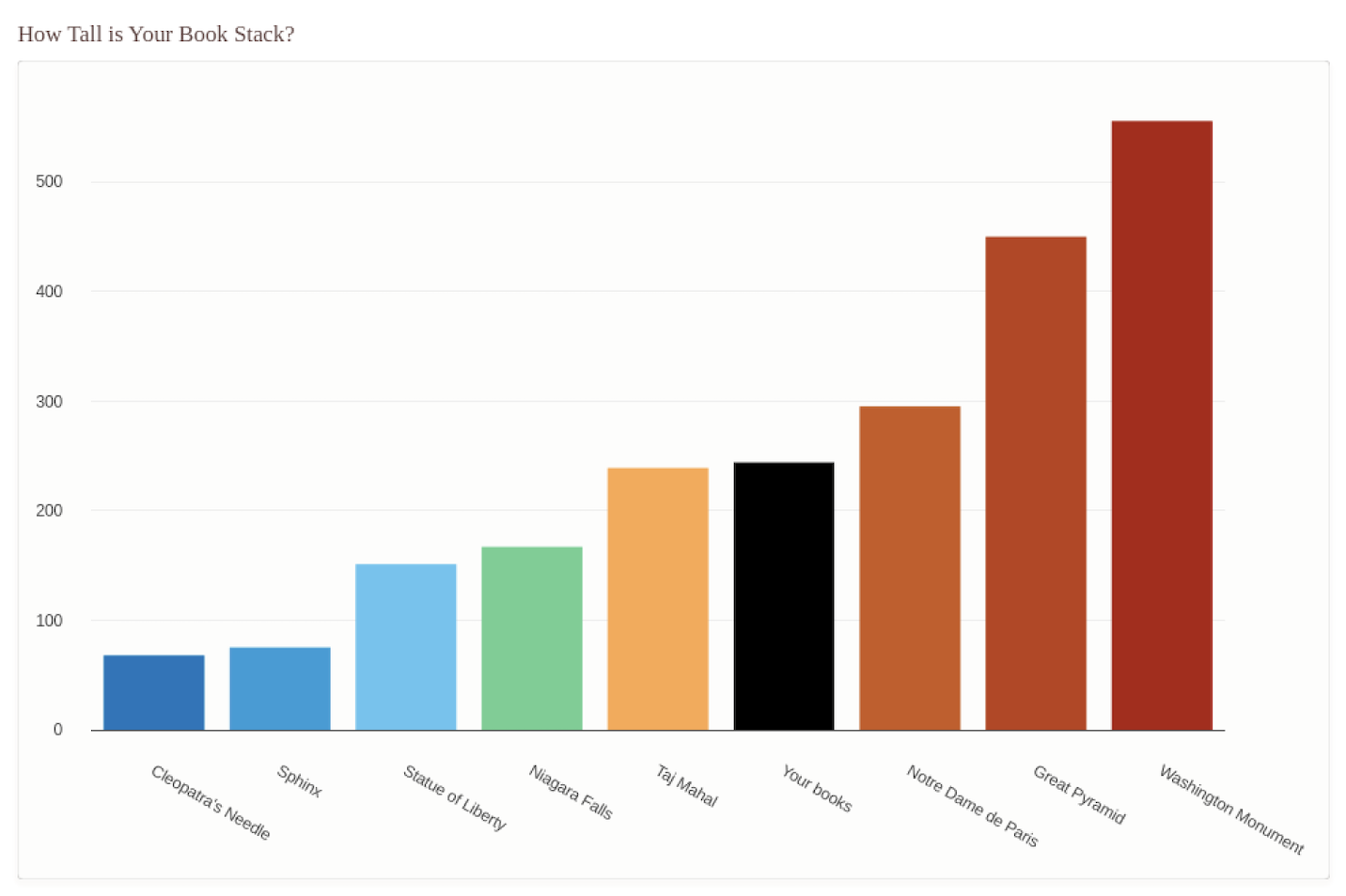 In any case, the library continues to grow, even if at a slower, slightly more “reasonable” pace. If the internet is to be believed, if I stacked the whole bunch of them atop one another, I’d have a tower of books ever so slightly taller than the Taj Mahal and growing towards striking distance of the Notre Dame cathedral.