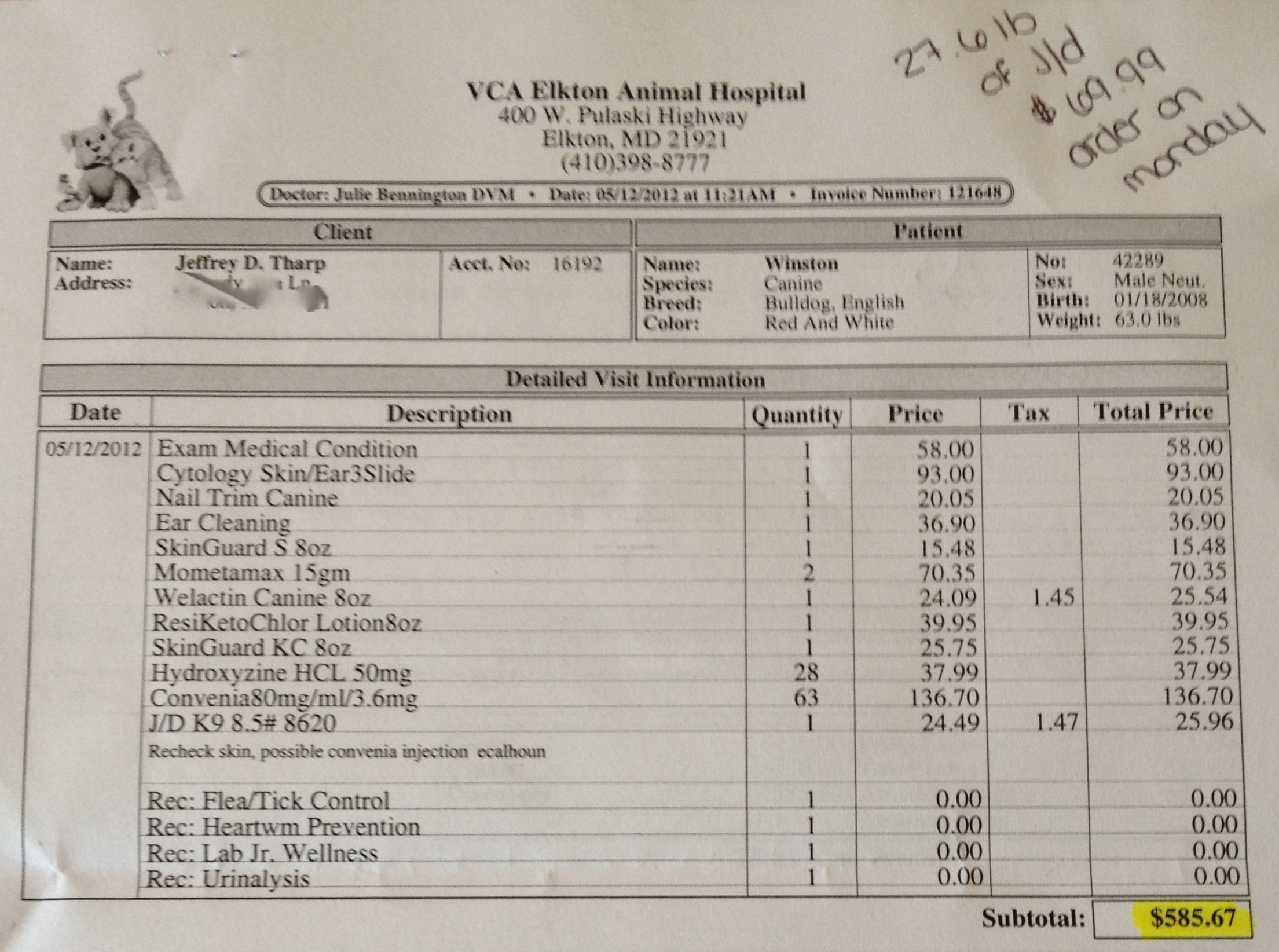 I’ve said it before, but this seems like the perfect opportunity to reiterate that I love both my dogs beyond any sense of reason or logic. That’s the only reason I can think of that would have had me at the emergency vet at 1:00 in the morning on a Sunday with a Bulldog that wouldn’t stop throwing up even when there were no cookies left to hurl. I’m not a fancy big city vet, but I do know that no well animal blows chunks nine times in three hours. I’m enough of a diagnostician to know that gums are supposed to be pink and not gray. And of course being paranoid as I am, that let to an early morning visit to the closest emergency vet clinic. I’ll say up front that I’m glad they were open and I didn’t have to wait until Monday to have him seen by someone.